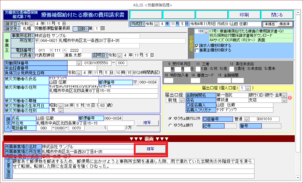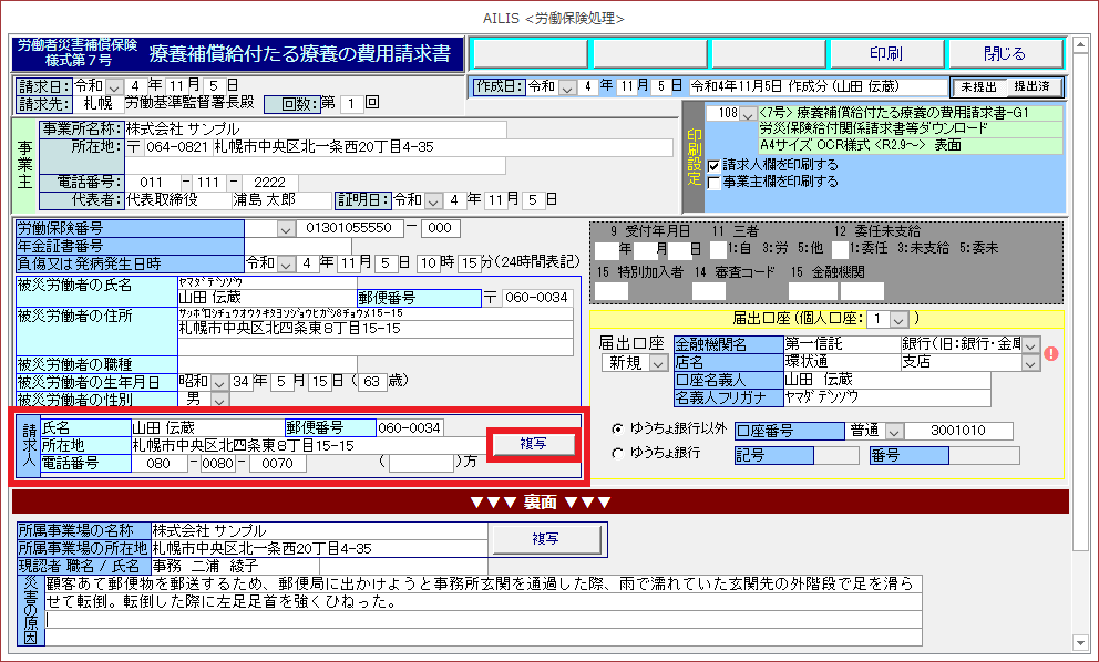 ④請求人欄の[複写]を選択すると、被災労働者の情報が読込されます。