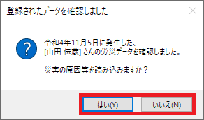 ※先に[労働者私傷病報告<23号>]などを作成していた場合、登録データ確認画面が開きます。災害の原因等の読み込みを[はい][いいえ]で選択できます。