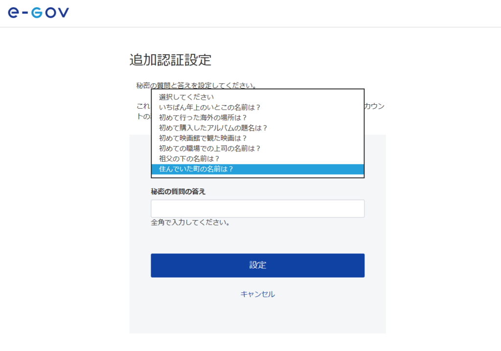 ④スキップを選択した場合、秘密の質問と答えを入力し、「設定」を選択して認証設定します。