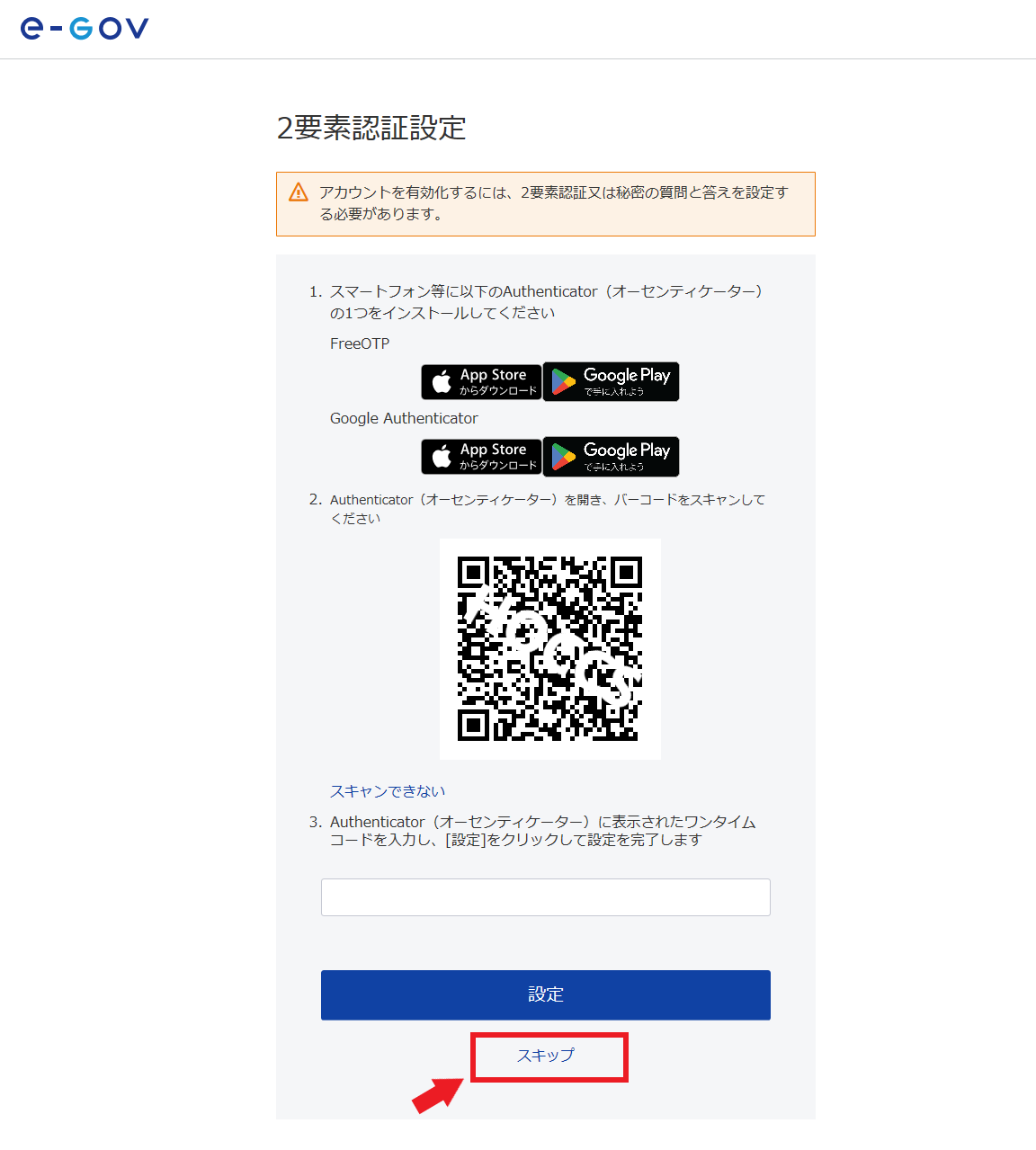 - 秘密の質問による認証設定:「スキップ」を選択します