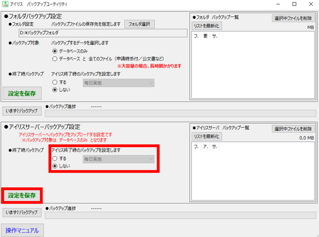 - アイリス終了時のバックアップの有無を[する・しない]から選択します。