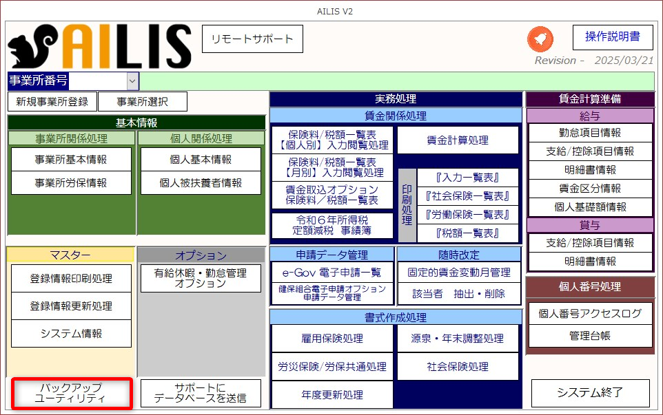 ①アイリストップメニューより[バックアップユーティリティ]を選択します。