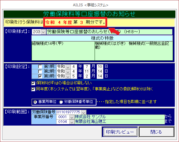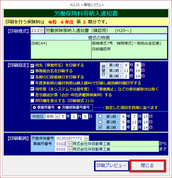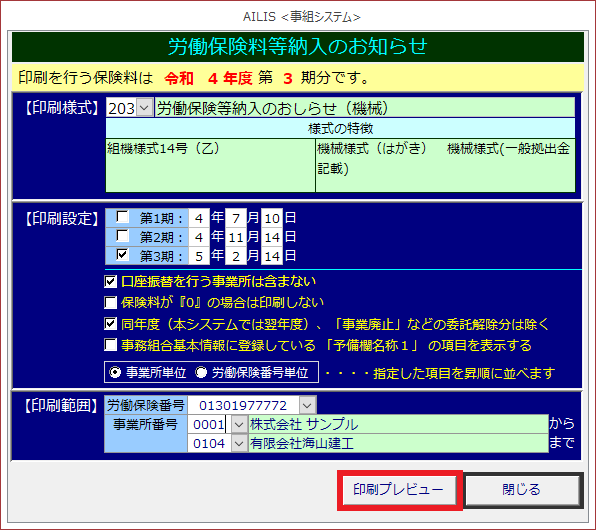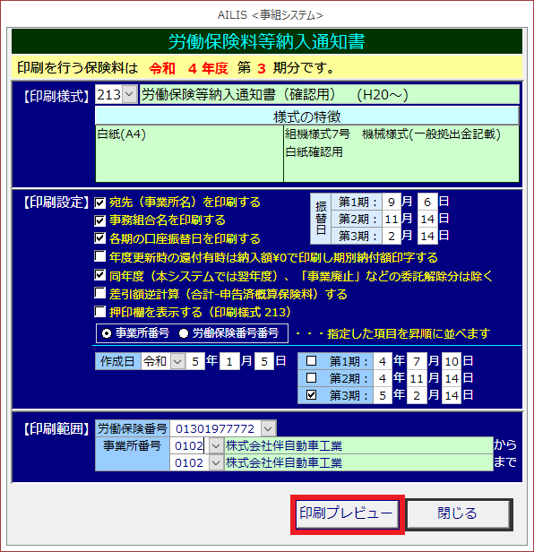 労働保険料納入のお知らせの様式を印刷する場合に利用します。