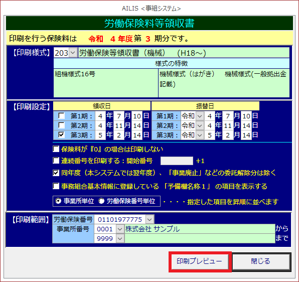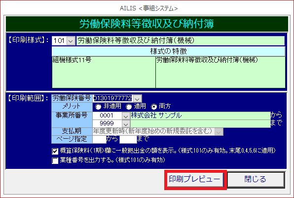 労働保険料等徴収及び納付簿の様式を印刷する場合に利用します。また、事業所の期別保険料集計表・請求表等もこの画面から印刷できます。