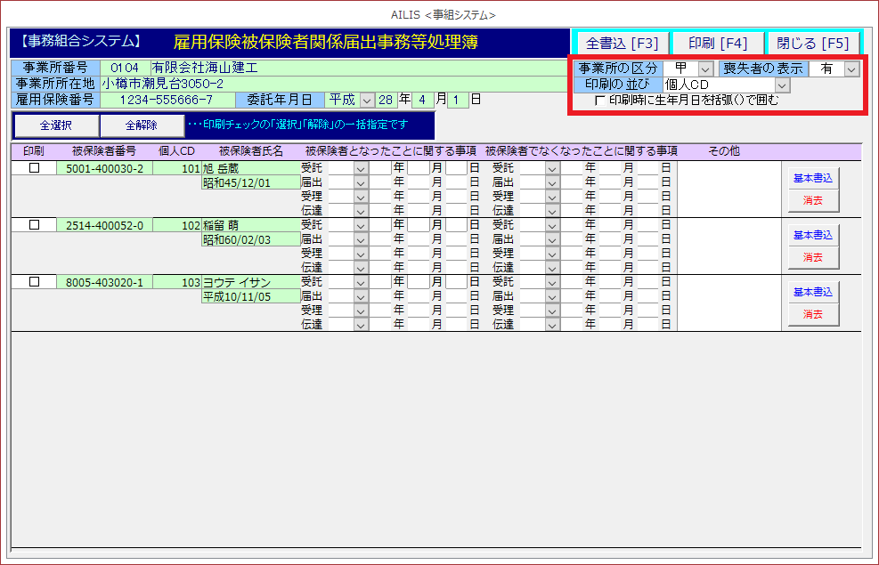 ③[事業所の区分]、[喪失者の表示]、[印刷の並び]を設定します。