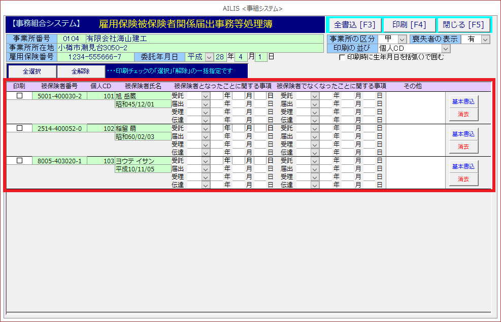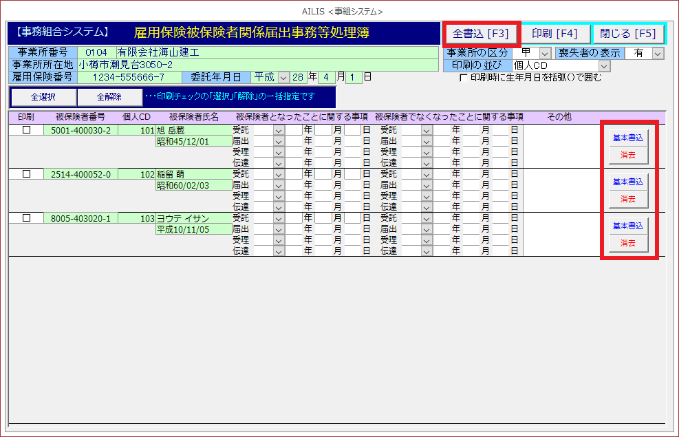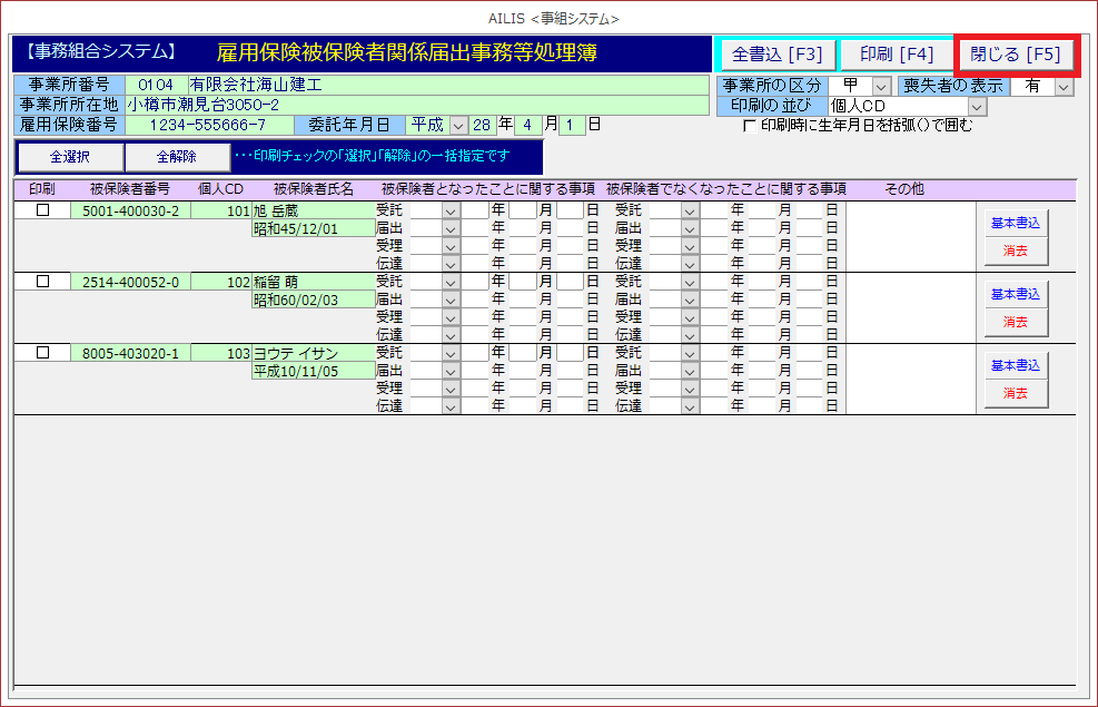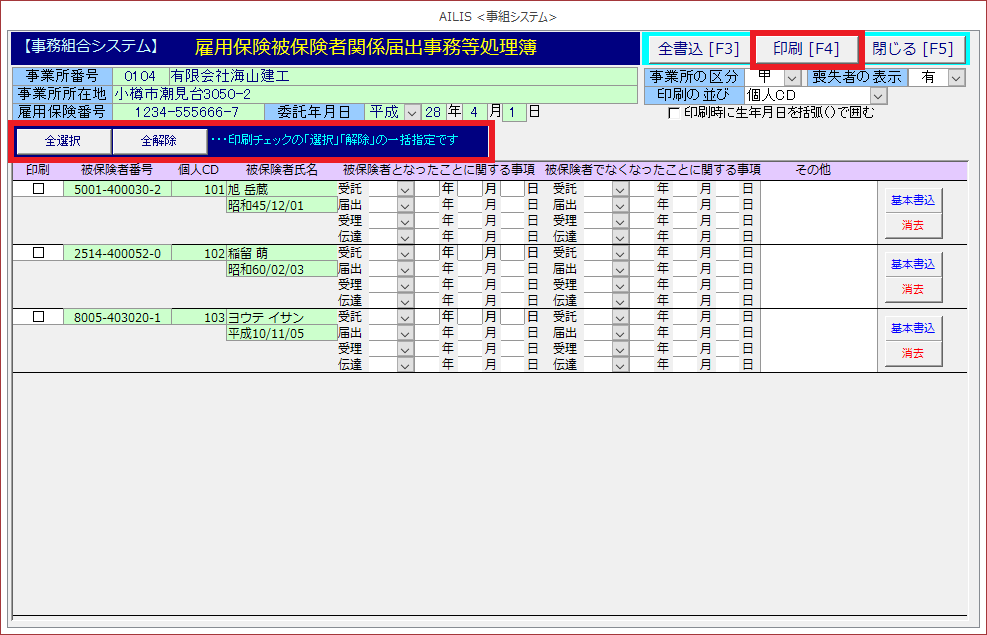 労働保険雇用保険被保険者関係届出事務等処理簿の様式を印刷する場合に利用します。