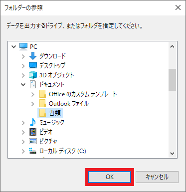 ④フォルダーの参照画面で、ファイルの保存先を指定して[OK]を選択します。